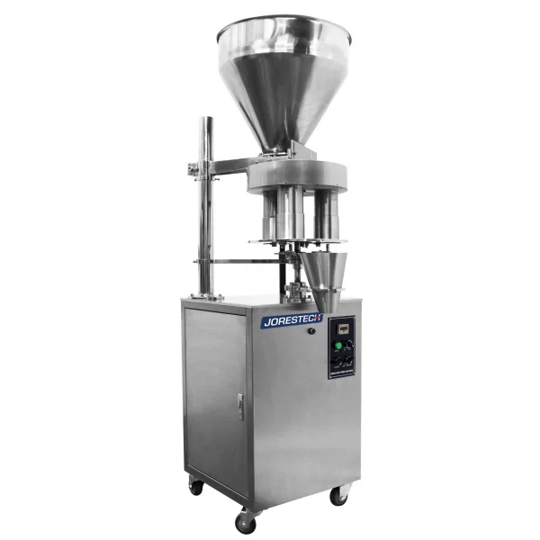Los rellenos volumétricos vienen equipados con una o más copas volumétricas, que se alimentan por gravedad desde una tolva. El producto fluye hacia la taza, y el contenido de la taza se distribuye en el paquete. El peso del producto se cambia ajustando el volumen de la taza. Las tazas más pequeñas dispensan menos producto, mientras que las tazas más grandes dispensarán más.